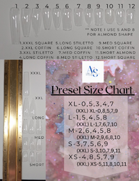 The current shapes and lengths I have avaliable. Please order the size kit to the corresponding shape you want your nail set to be made in not different. Example-You want Medium Coffin set DO NOT order the Short Square size kit but the Med Coffin. Due to the shapes being different they won’t size the same.