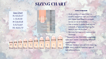 Here just follow the steps to measure your nails then match up your size to the chart. Size up if you are between sizes. If your sizes aren't on the chart send in your custom sizes.